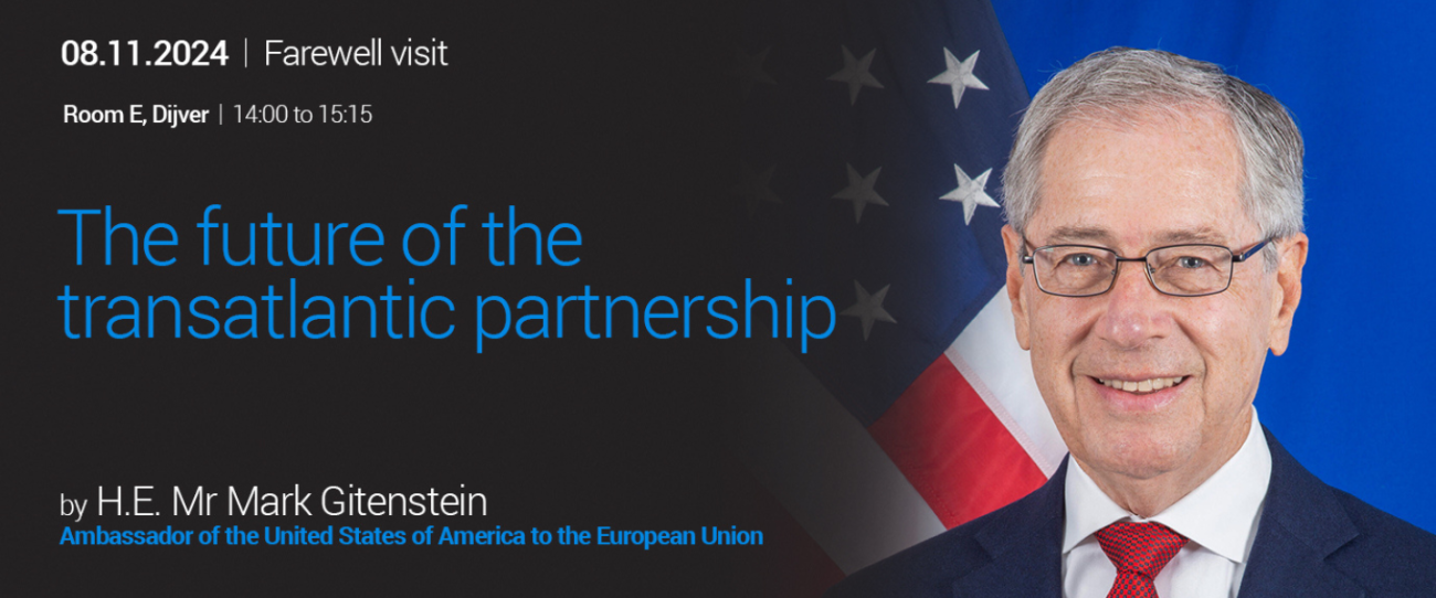 On 8 November 2024, the College of Europe in Bruges will host a distinguished guest, H.E. Mr Mark GITENSTEIN, Ambassador of the United States to the European Union, who will deliver a keynote address on "The Future of the Transatlantic Partnership".