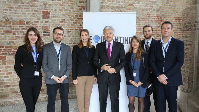 Re-Inventing Europe team 2015 (from left to right): Simona PRONCKUTE (Borsellino-Falcone promotion), David SCHAFER (Vaclav Havel Promotion), Zoë IMHOF (Voltaire promotion), Didier REYNDERS (Belgian Vice Prime Minister and Minister of Foreign Policy and European Affairs), Kathleen BURKHARDT (Voltaire promotion), Clemens DOMNICK (Vaclav Havel Promotion), Stefan DIEDERICH (Vaclav Havel Promotion)