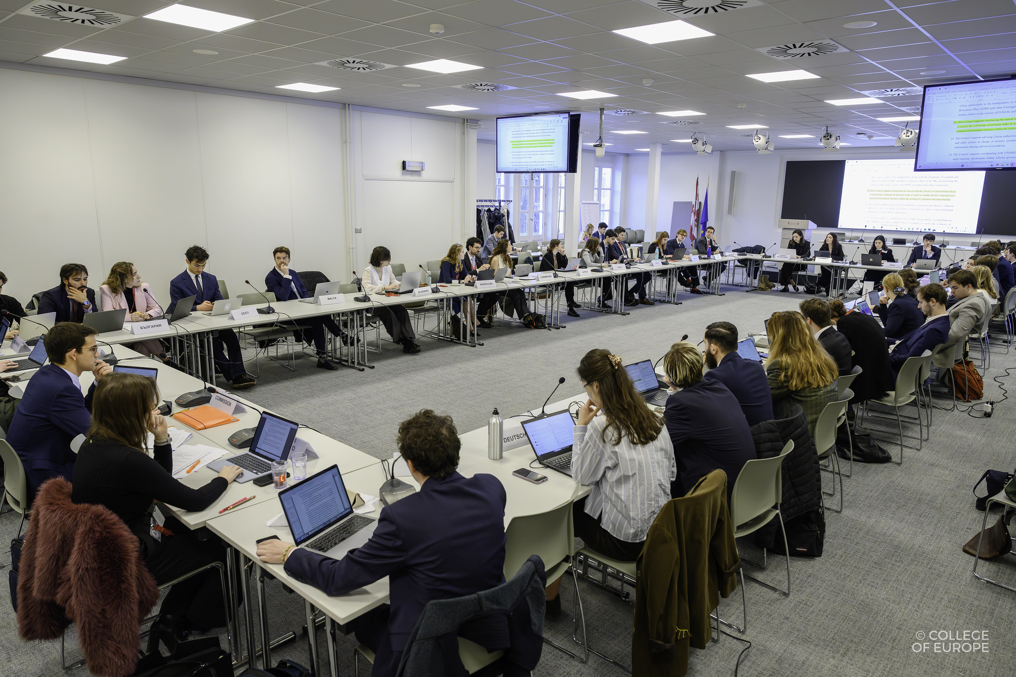 The students of EU International Relations and Diplomacy Studies (IRD) at the College of Europe in Bruges embarked upon a simulation of the negotiations of the EU’s response to international crisis scenarios in the EU’s Eastern neighbourhood and in Northern Africa. For an entire week, from 2 to 6 February 2026, the students played the roles of EU institutions (European External Action Service, Council of the European Union and European Commission) and Member States (Ministers, COREPER and PSC Ambassadors and Working Group experts).