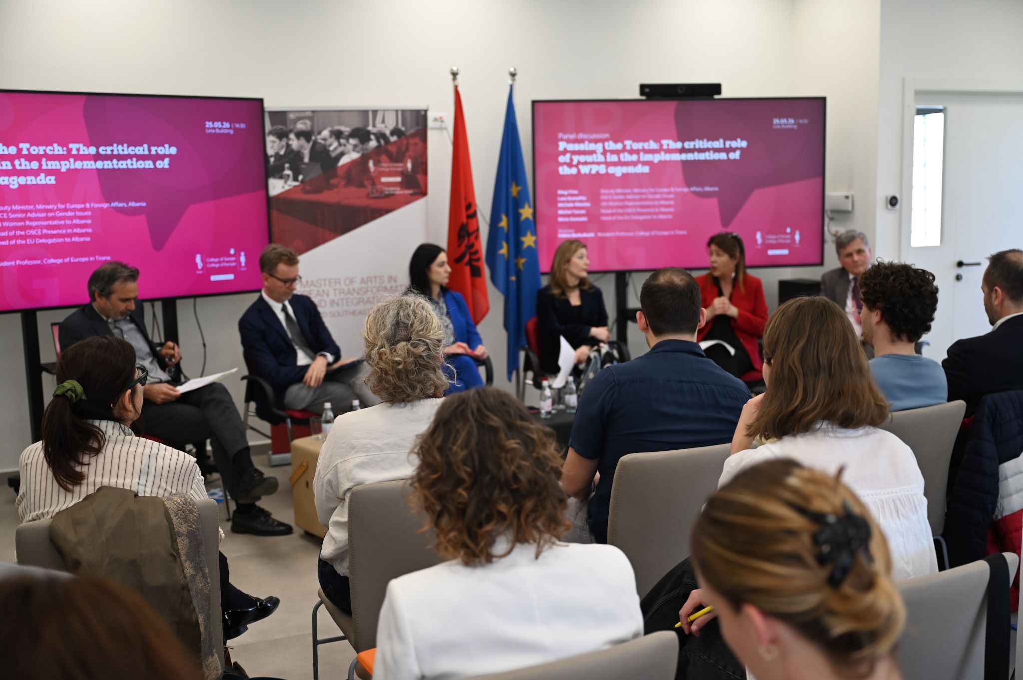 A round of applause to our speakers, Silvio Gonzato, Ambassador of the EU Delegation to Albania, Megi Fino, Deputy Minister, MEFA of Albania, Lara Scarpitta, OSCE Senior Adviser on Gender Issues, Michele Ribotta, UN Women Representative to Albania, and Michel Tarran, Head of the OSCE Presence in Albania for bringing their expertise into our classroom.